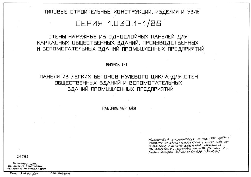 Выпуск 1-1. Панели из легких бетонов нулевого цикла для стен общественных зданий и вспомогательных зданий промышленных предприятий.