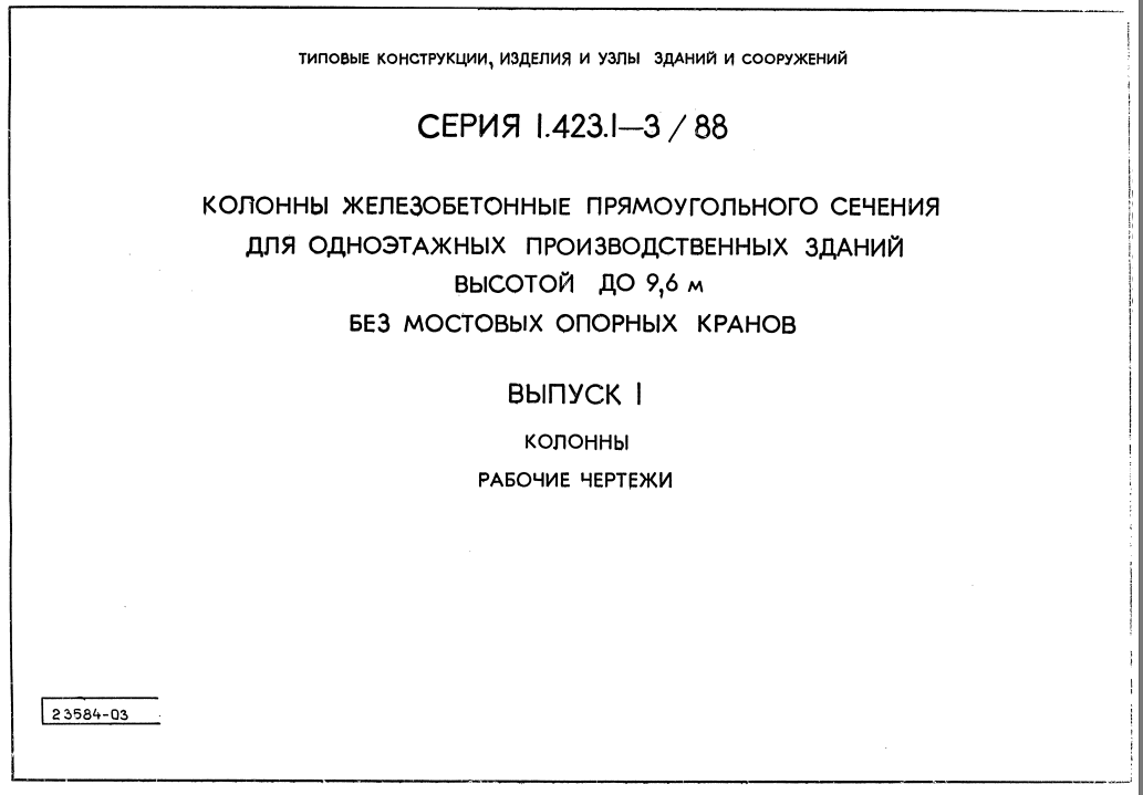Серия 1.423.1-3/88. Колонны железобетонные прямоугольного сечения для одноэтажных производственных зданий высотой до 9.6 м без мостовых опорных кранов