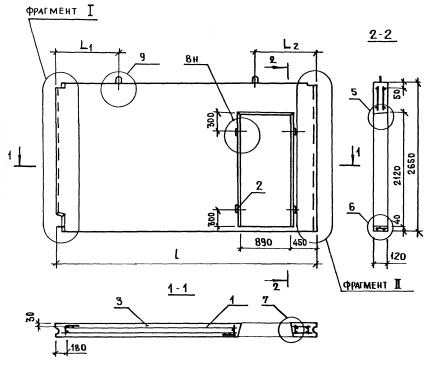 1,2,1,1 - индексы, характеризующие положение панелей в плане здания и их конструктивные особенности ( 1-панели поперечных стен или панели продольных стен, примыкающих к торцу здания; 2 - панель с проемом, 1 - ширина проема 890 мм; 1 - ширина меньшего простенка 390 мм).